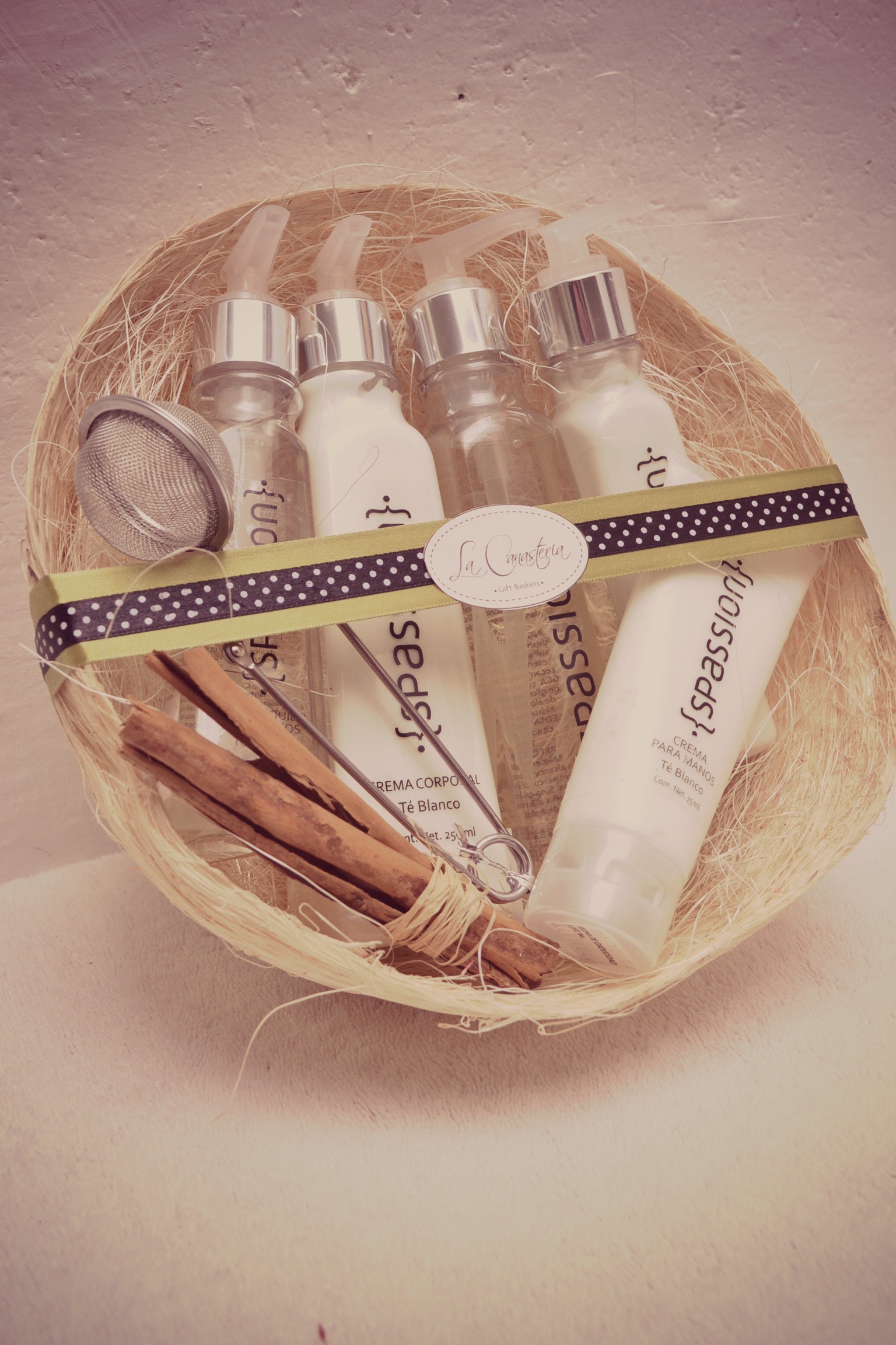 The White Tea Spa Basket incluye un set completo de cremas de Spassion de Té Blanco más un difusor de té metálico y sticks de canela como acento perfecto.
