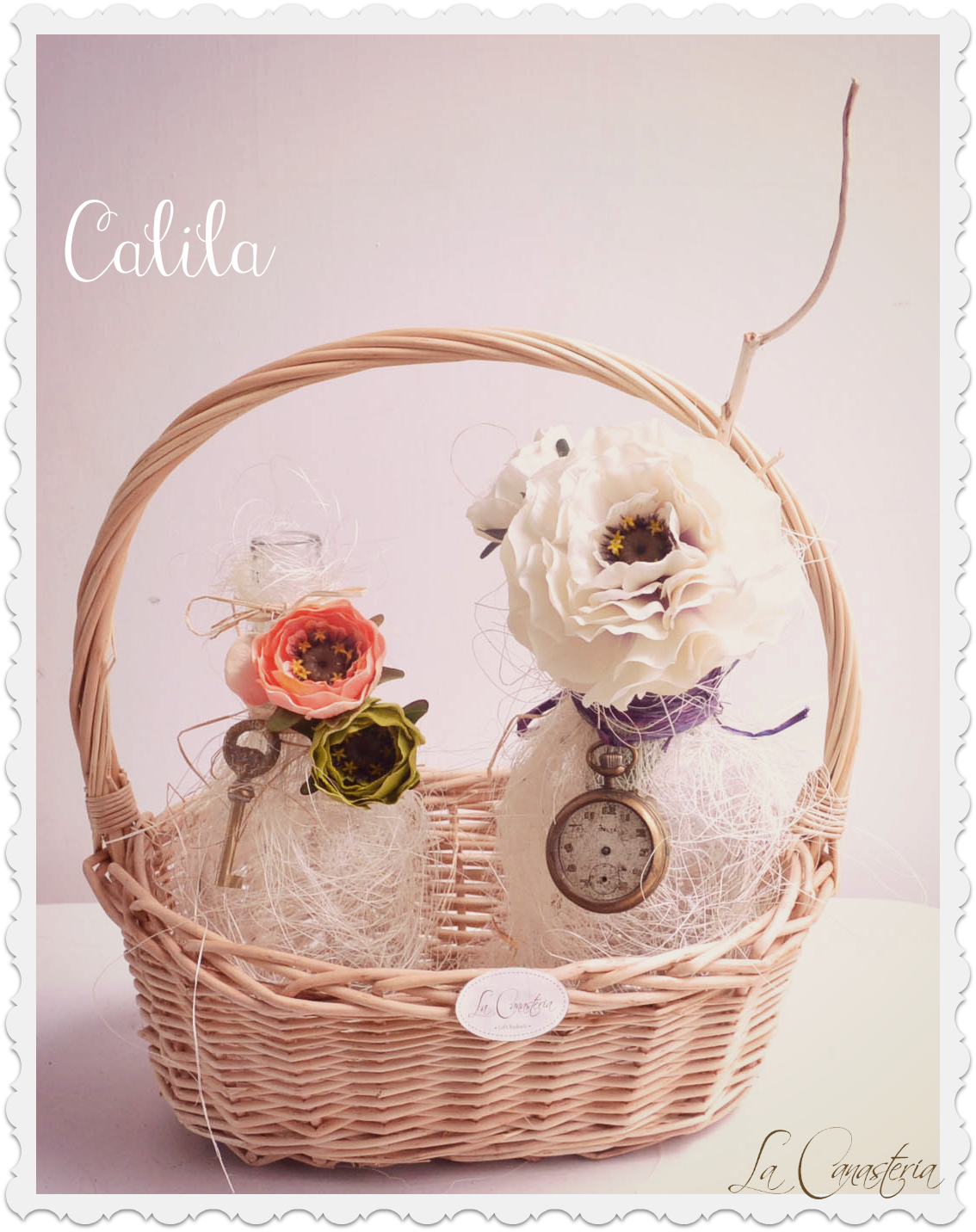 CalilaBasket_Title_LogoCalila es una elegante creación con acentos románticos y una gift basket única por tener tesoritos one-of-a-kind  como botellas de botica y un hermoso reloj antigüo de bolso. Diseñada con acentos florales de peonies artificiales en una elegante canasta de mimbre, es un regalo memorable para diversas ocasiones y cada pieza, ya sea en conjunto o por separado, es un acento único para el hogar que dura para siempre. Nos encanta esta Vintage Gift Basket ya que es un regalo de belleza, acentos sutiles y arte.  Podemos hacer arreglos con flor natural o artificial
