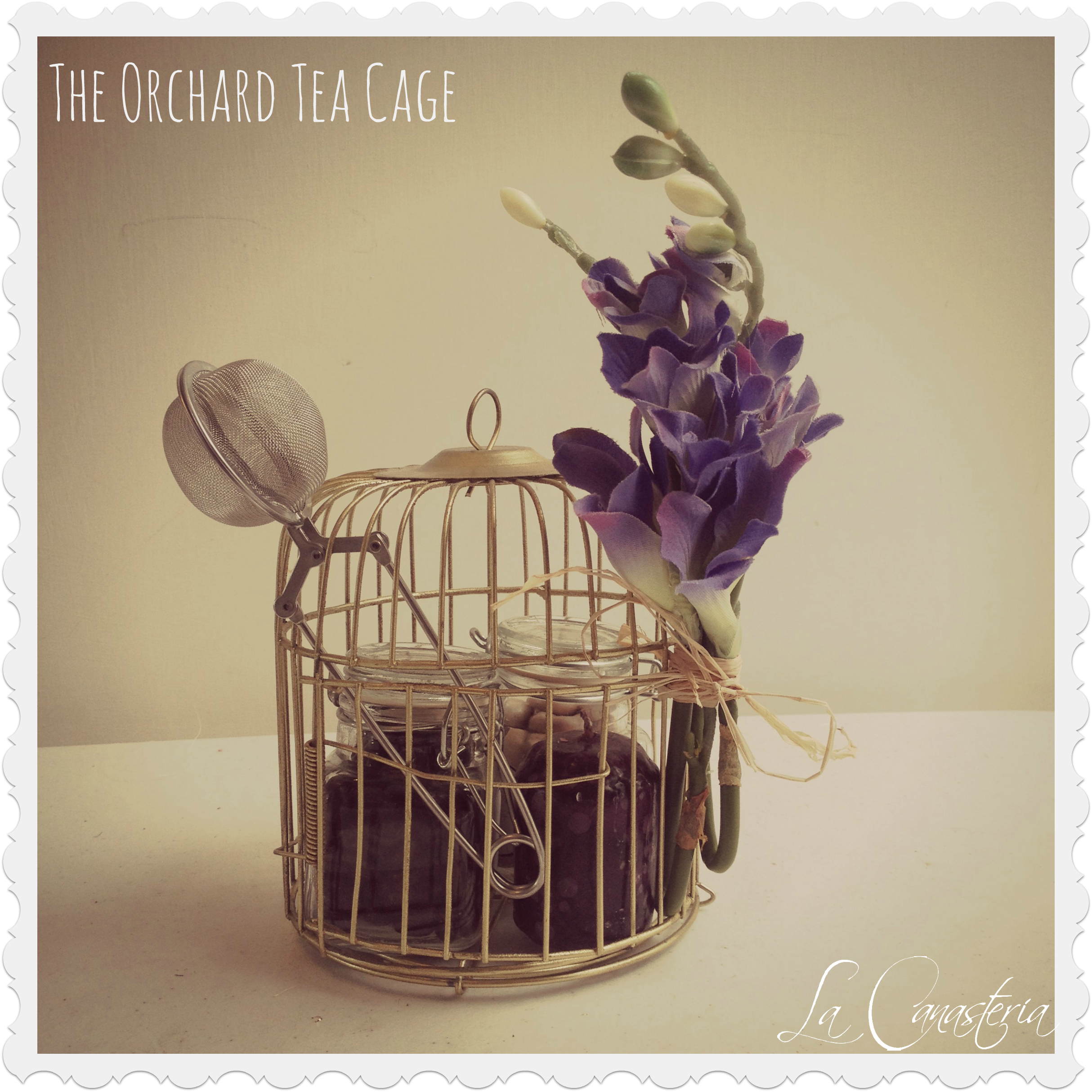 The Orchard Tea Cage es una propuesta más petite en una hermosa jaula de pájaro dorada e incluye un frasco hermético con Té Chai, 1 con Ojos Azules, una vela aromática, infusor de té y un hermoso acento floral lavanda.