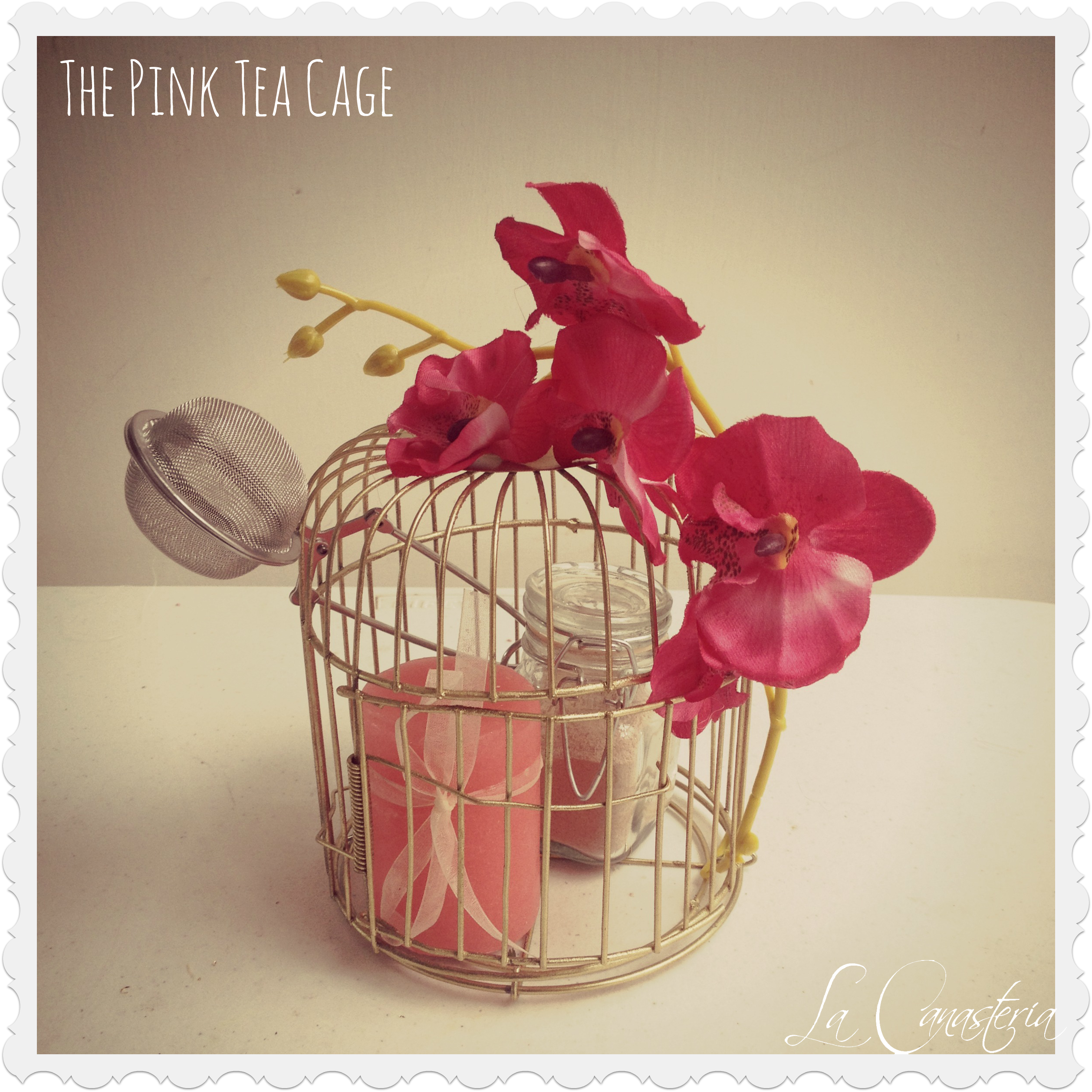 The Pink Orchid Tea Cage es una de nuestras mini tea cages en una hermosa jaula de pájaro dorada e incluye un frasco hermético con Té Chai, 1 con Ojos Azules, una vela aromática, infusor de té y un hermosa vaina de orquídea rosa mexicano.