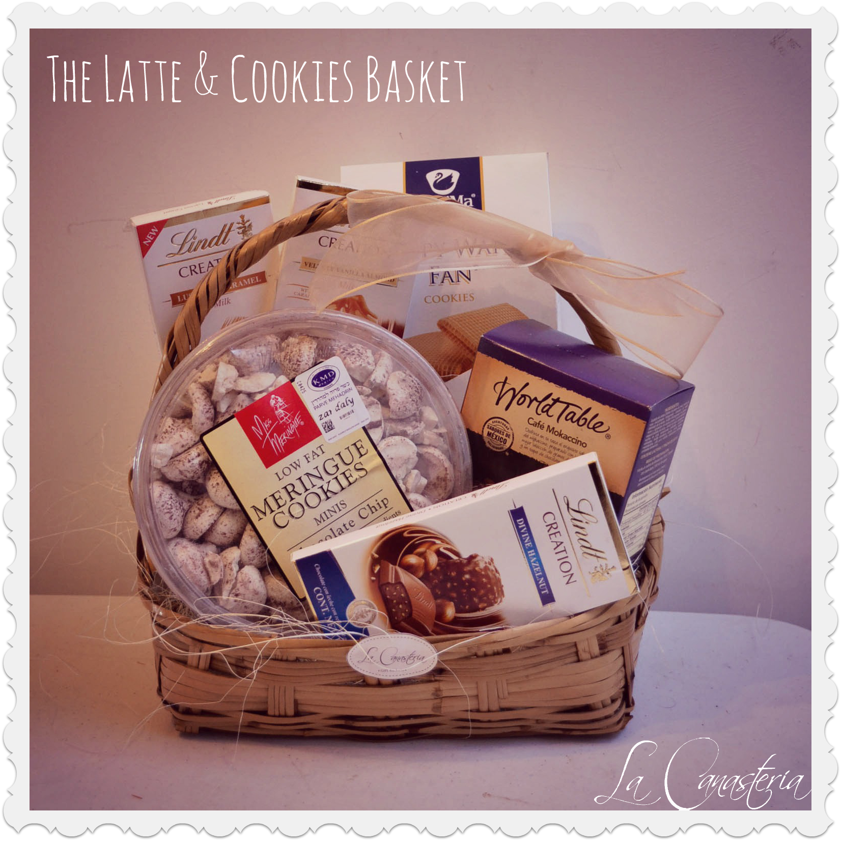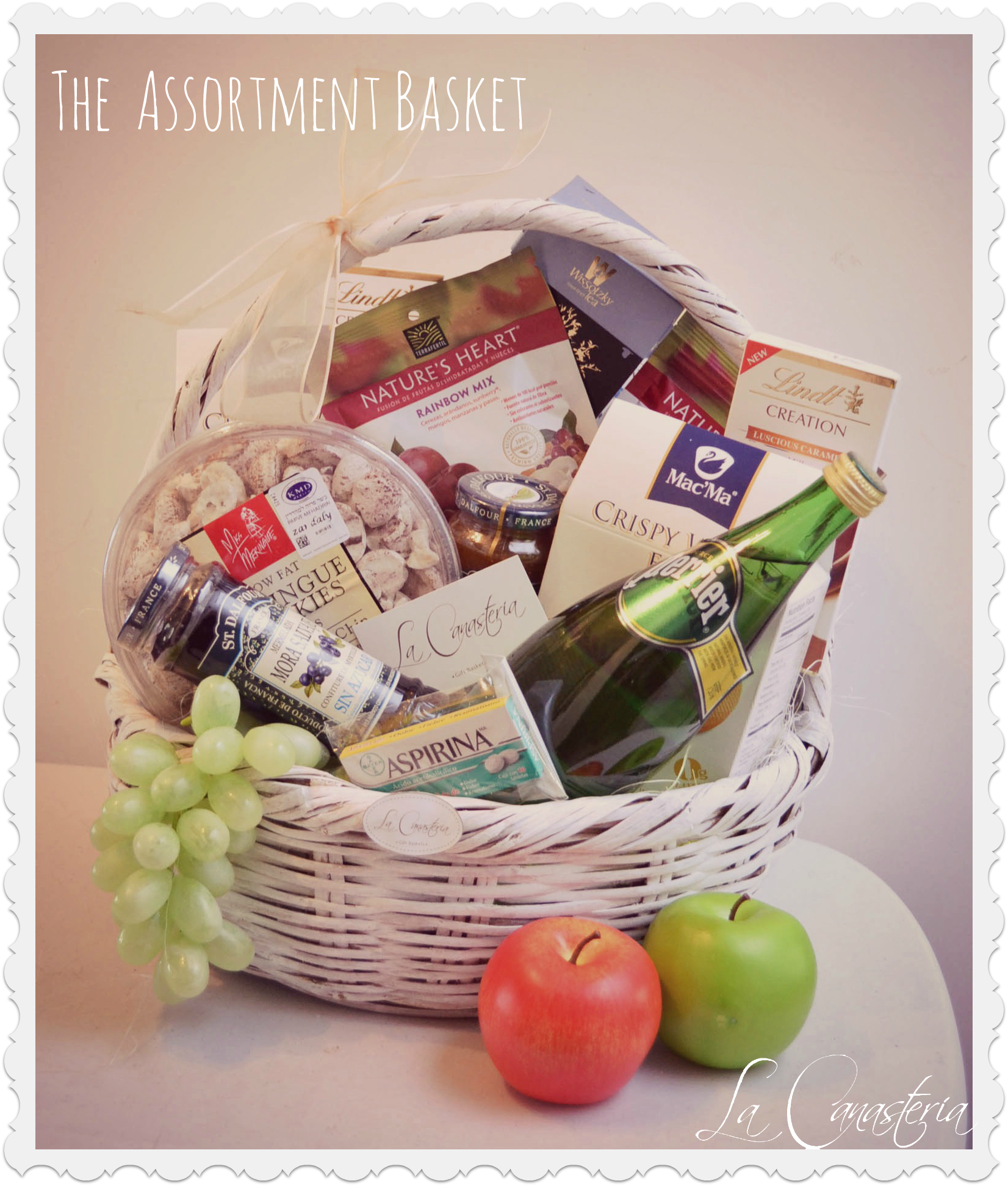The Assorment Basket…una gift basket que habla por sí sola con una deliciosa selección de todo tipo de delicias! Es una Gift Basket perfecta como detalle “Get Well Soon” (por eso las aspirinas 😉 ) o como un elegante regalo corporativo ya que incluye tantas opciones que seguramente va a hacer feliz a muchos en la casa! Puedes armar tu propia gift basket sobre presupuesto, temática o productos!