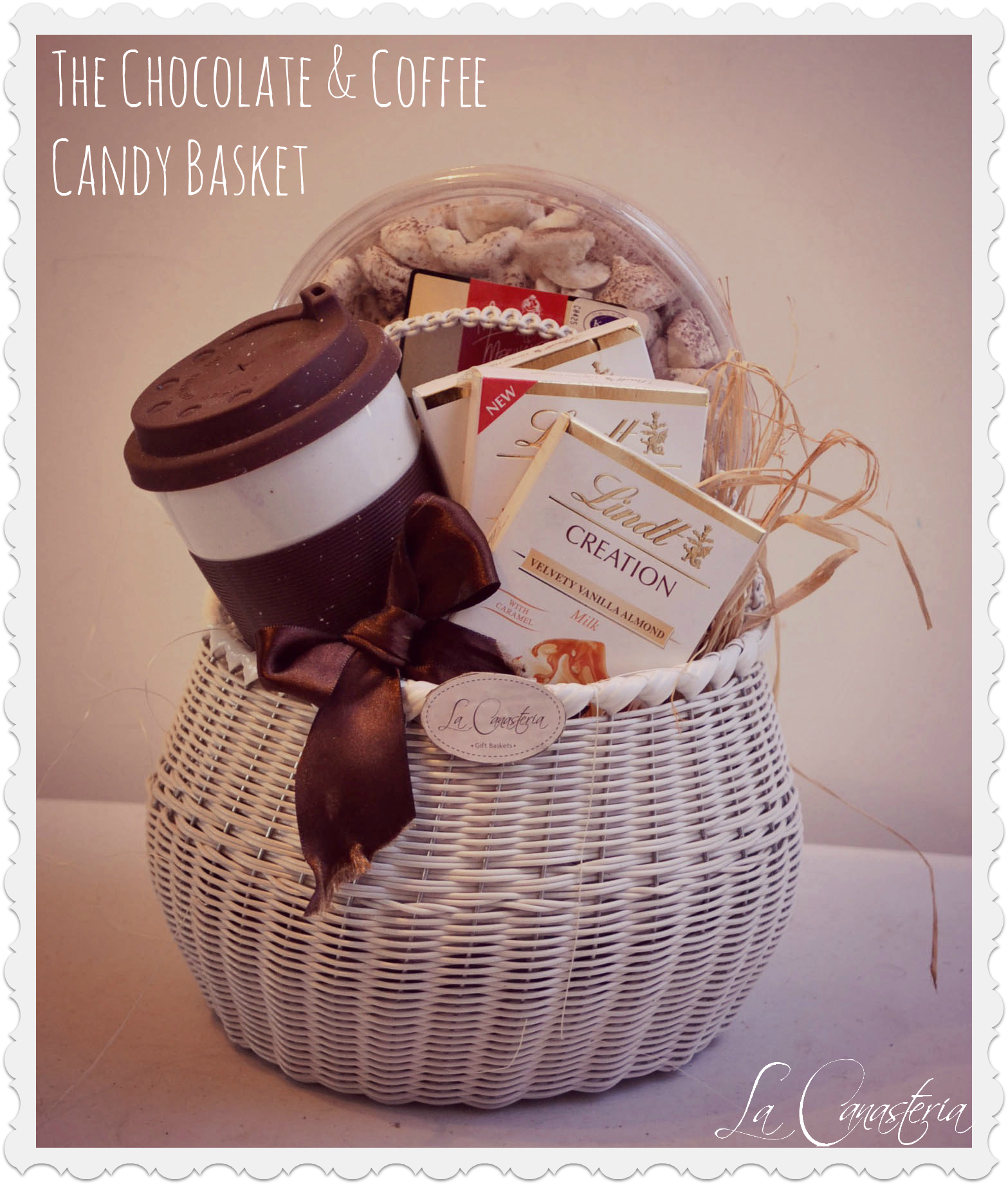 The Chocolate And Coffee Candy Basket  es una dulzura de canasta repleta de chocolates, con merengues de café y un termo perfecto para andar de arriba a abajo! A parte queda perfe el novio, mejor amiga, colega de trabajo, suegra o cualquier amante de chocolate y café! y esta canastita artesanal mexicana es buenísima para usar posteriormente en la casa!