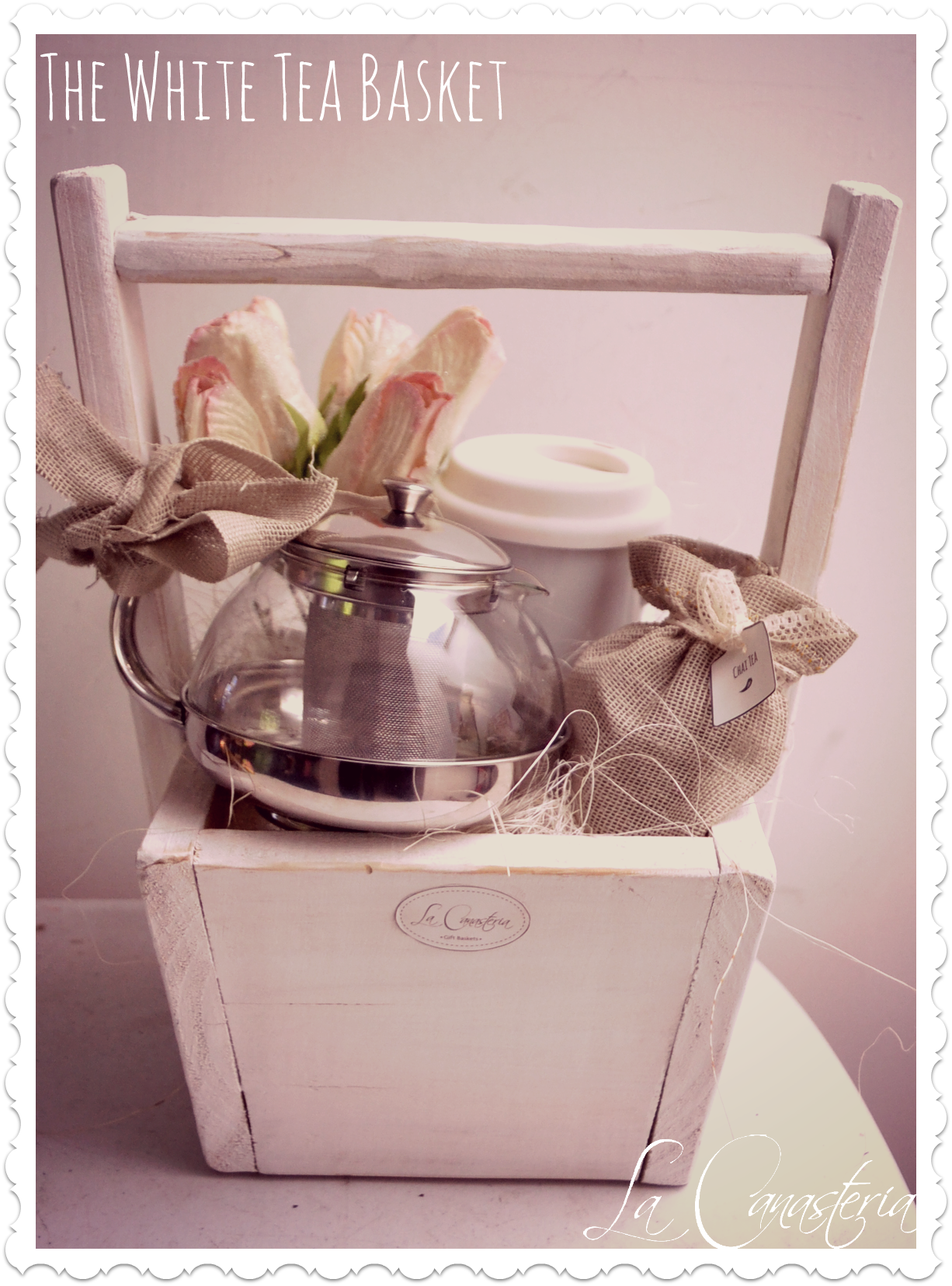 The White Tea Basket es una linda y femenina canasta con una tetéra clásica para tisanas gourmet y elegantes accesorios de té en una chulísima canasta de pino.