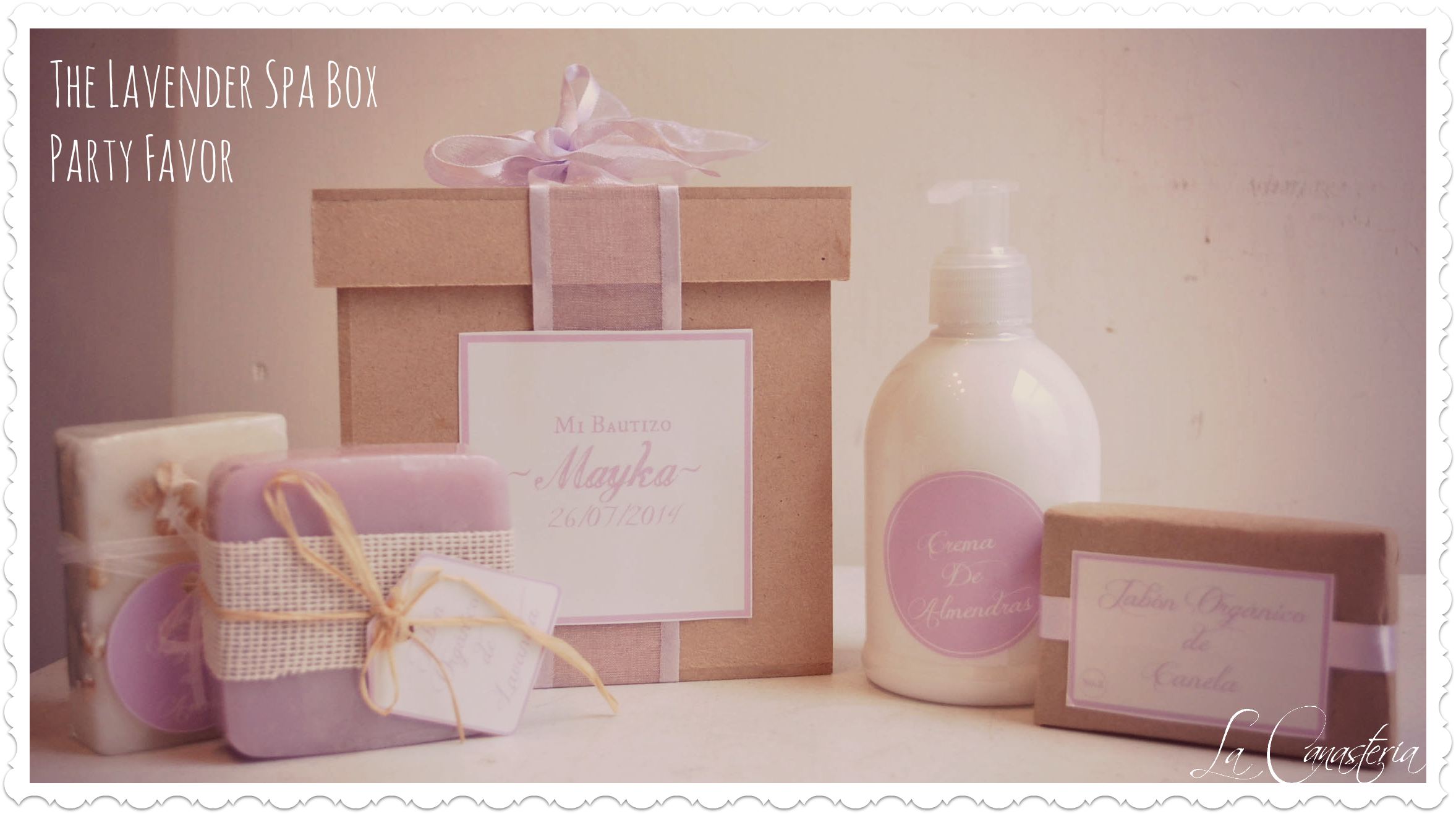 TheLavenderSpaBox_partyfavor_titlelogoThe Lavender Spa Box es un recuerdo para eventos inolvidable que recomendamos ampliamente en La Canastería por su fina selección de jabones orgánicos y crema corporal de almendras en una elegante caja de madera con toques cálidos y etiquetas personalizadas al gusto. Cada jabón incluye etiqueta y cálido diseño así como toques shabby chic. Pedido Mínimo 20 piezas.