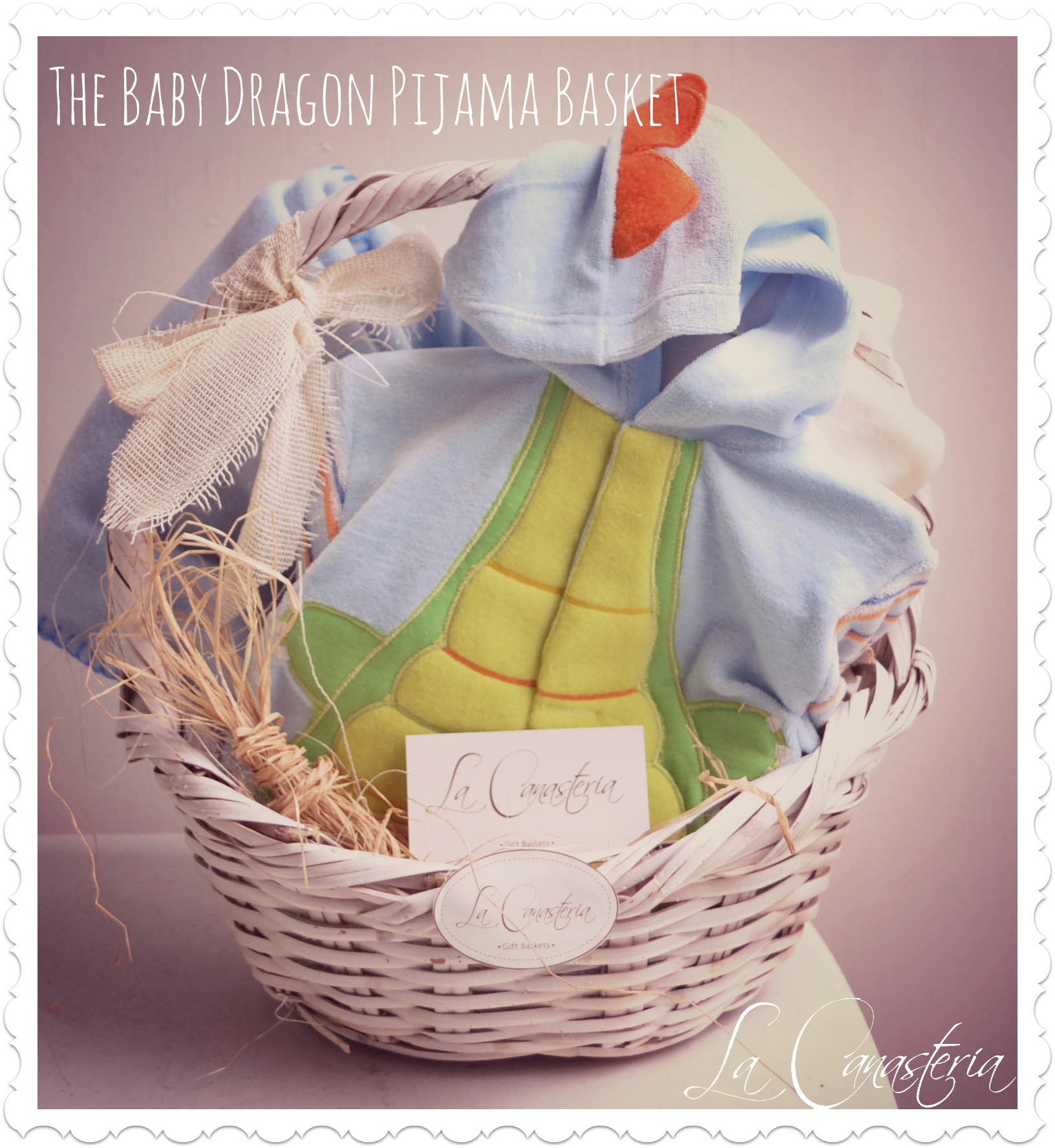 The Baby Dragon Pijama Basket es una monada de canasta con una simpática pijama estilo mameluco de dragón ! Incluye frazada polar para cuna azul bebé solida y cobija petite para carriola beige.