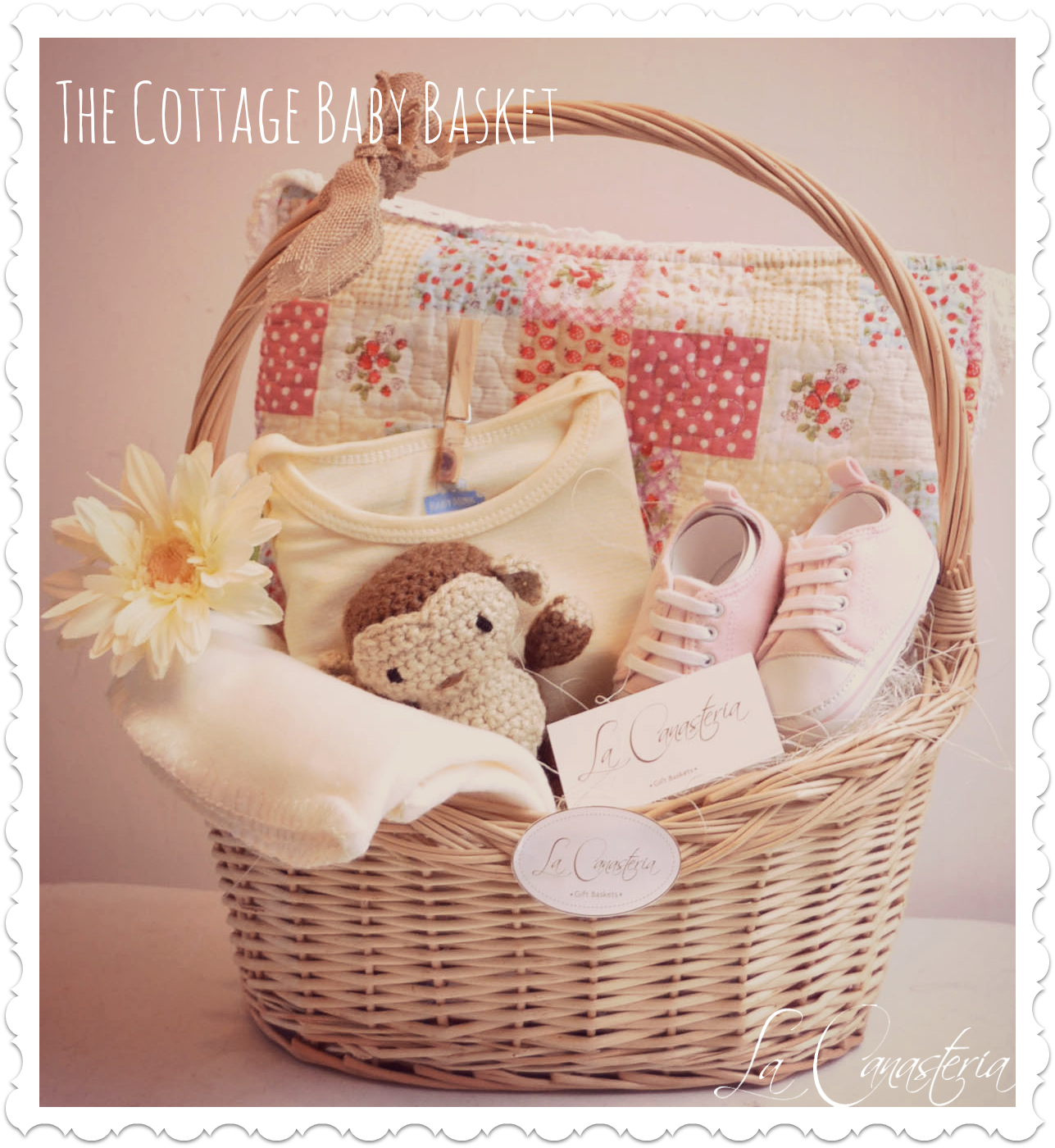 The Cottage Baby Basket es una canasta de regalo con un diseño acogedor y shabby que enamora a primera vista! Incluye almohada y peluche estilo vitnage, cobija calientita, tennis para bebé y más!