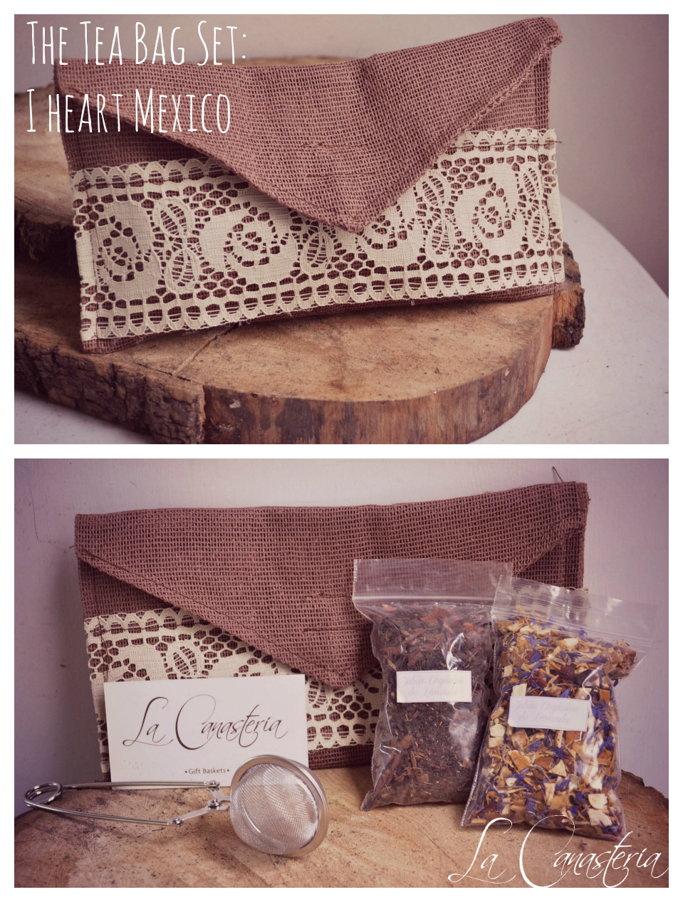 The Tea Bag Set: I Heart Mexico es un hermoso e inolvidable recuerdo para todo tipo de evento para los gustos mas exigentes con una hermosa bolsa de yute (cosmetiquera para uso posterior), con lindos acentos de encaje evocativos de México y dos bolsas herméticas con infusor de té y deliciosas tisanas gourmet como Pink Lemonade Tea y Ojos Azules.