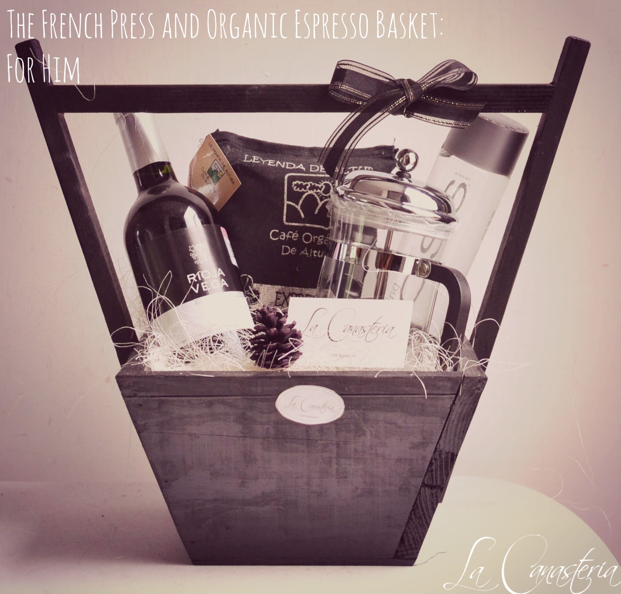 The French Press and Organic Espresso Basket: For Him es una fina canasta para caballero perfecta para regalos corporativos o bien para detalles personales! Incluye elegante prensa francesa para café, grano orgánico espresso de Chiapas y tinto Rioja de Vega. Te gusto? Tenemos mil opciones más!