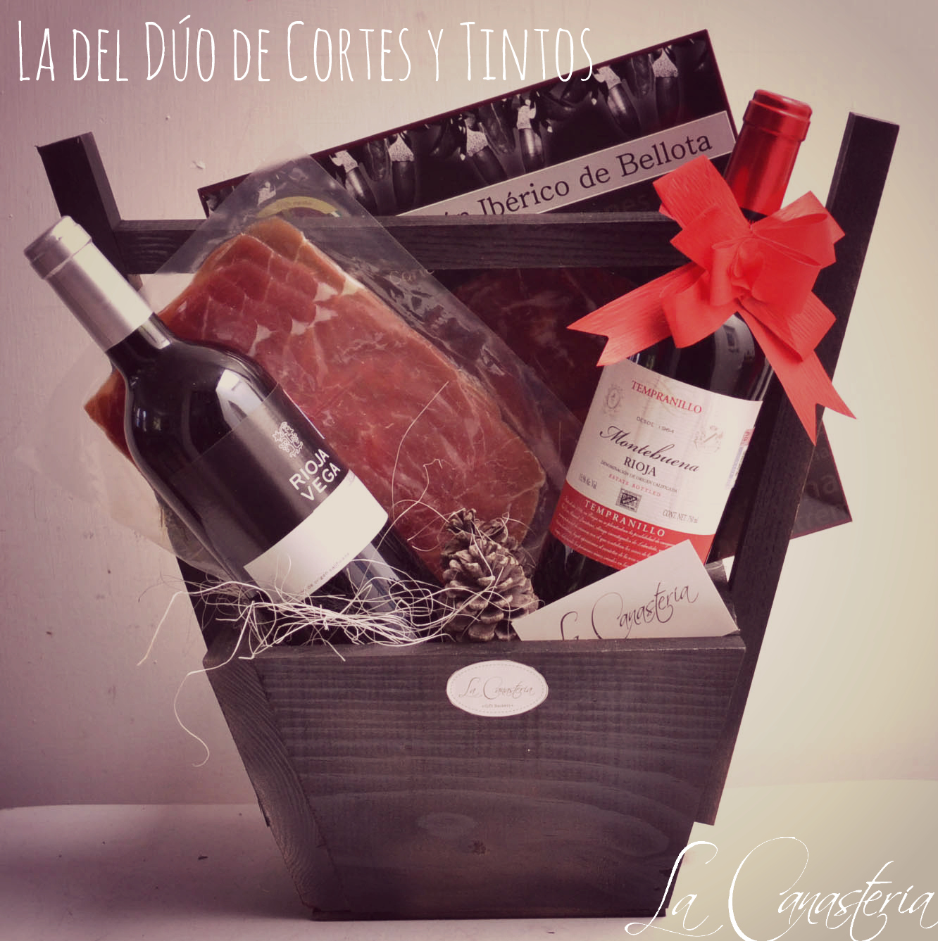 Ladelduodecortesytintos_title_logoLa del Dúo de Cortes y Tintos es una de nuestras favoritas para esta Navidad, perfecta para regalos corporativos o bien para todo tipo de regalos personales  con una deliciosa selección de Tintos y cortes españoles. Incluye tinto Rioja de Vega, Montebuena, Jamón Ibérico auténtico de Bellota y Jamón Serrano artesanal en una elegante presentación navideña.