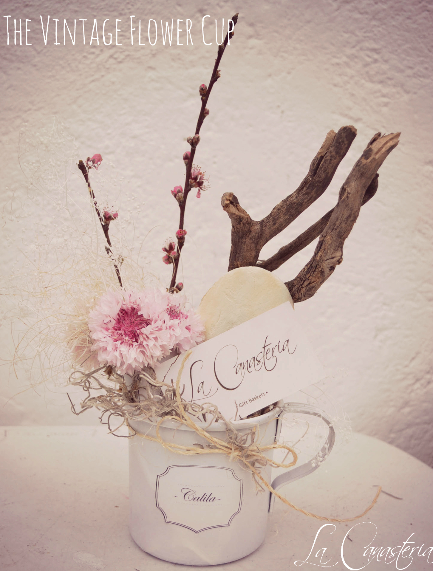 The Vintage Flower Cup es un diseñito floral inspirado para centros de mesa o bien como detallitos decorativos para invitados. Incluye follaje natural, ramas de durazno, flores secas y acentos naturales únicos. ¿Te gustaría agregar un dije conmemorativo o algún otro detalle? Con gusto lo podemos acoplar y cotizar.