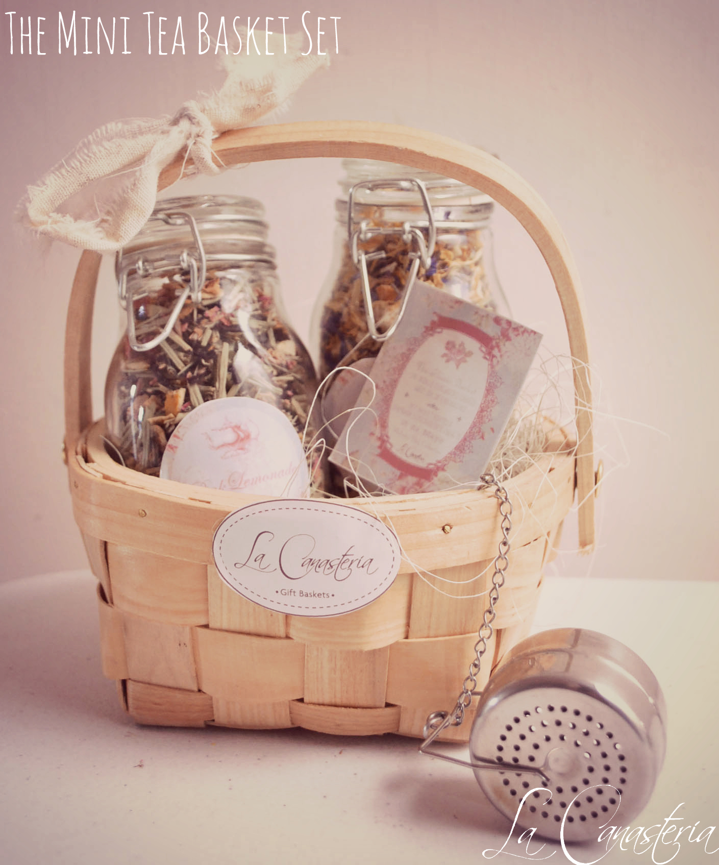 The Mini Tea Basket es una canastita que nos fascina para 10 de Mayo con dos frascos herméticos de vidrio con tisanas gourmet e infusor metálico en una cesta petite tejida a mano.