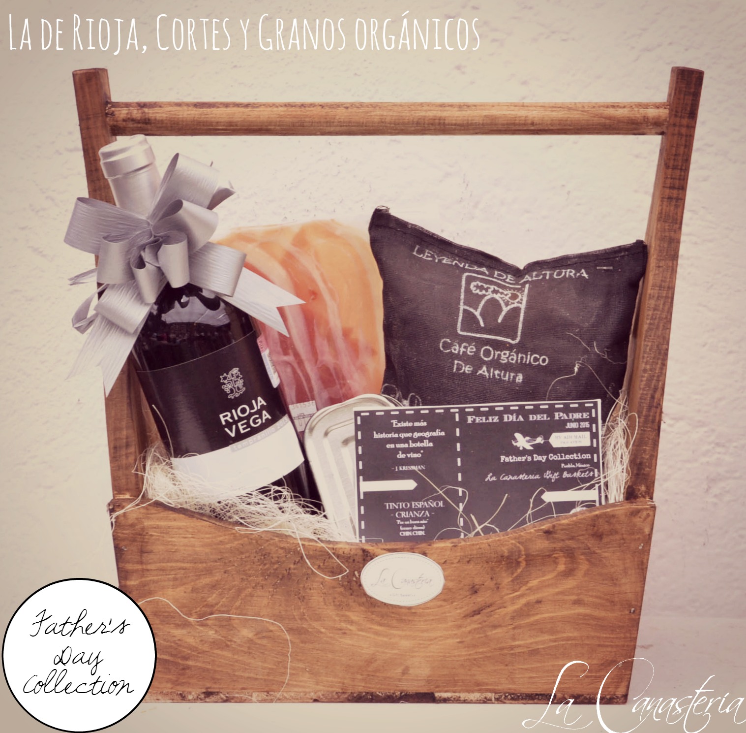 Laderioja,cortesygranosorganicos_title_logo_fathersdayLa de Rioja, Cortes y Granos Orgánicos es una propuesta para el día del padre que nos encanta con una selección variada para consentir a papá en una canasta de diseño con acabado rústico. Incluye tinto español de crianza Rioja Vega, granos orgánicos de chiapas, jamón serrano artesanal y mejillones en escabeche con tarjeta de ocasión.