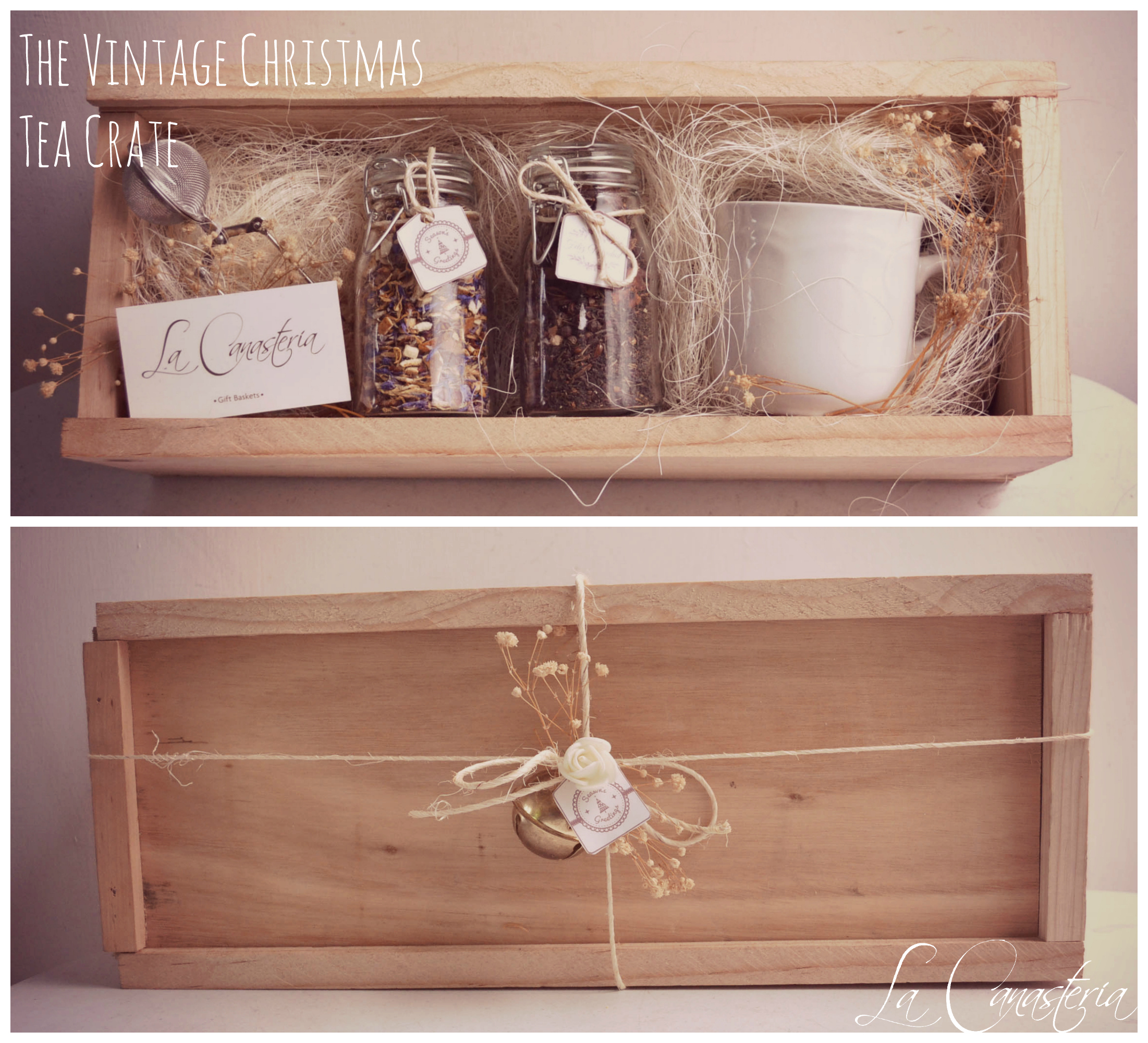 The Vintage Christmas Tea Crate es un fino regalo para mujer con cálidos toques navideños y elegante set de té en una hermosa cajita de madera con tapa perfecta para uso posterior. Incluye dos frascos de vidrio herméticos con tisana gourmet, una taza estilo retro para infusión y elegante infusor metálico. Lo manejamos todo el año