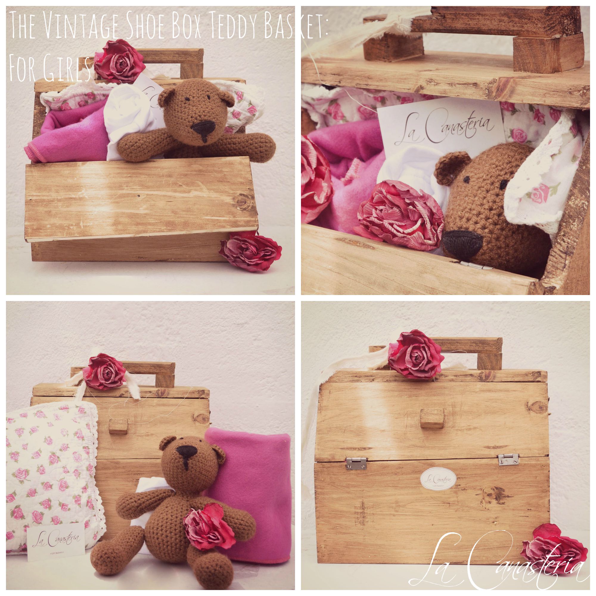 The Vintage Shoe Box Teddy Basket: For Girls es uno de nuestros diseños favoritos all time con una hermosa caja de zapatero estilo vintage con acabado rústico artesanal y una hermosa selección de sorpresitas para bebé recién nacida con nuestro Teddy tejido a mano. Esta canasta de regalo para bebé es un detalle inolvidable para dar la bienvenida y sorprender a mamá!