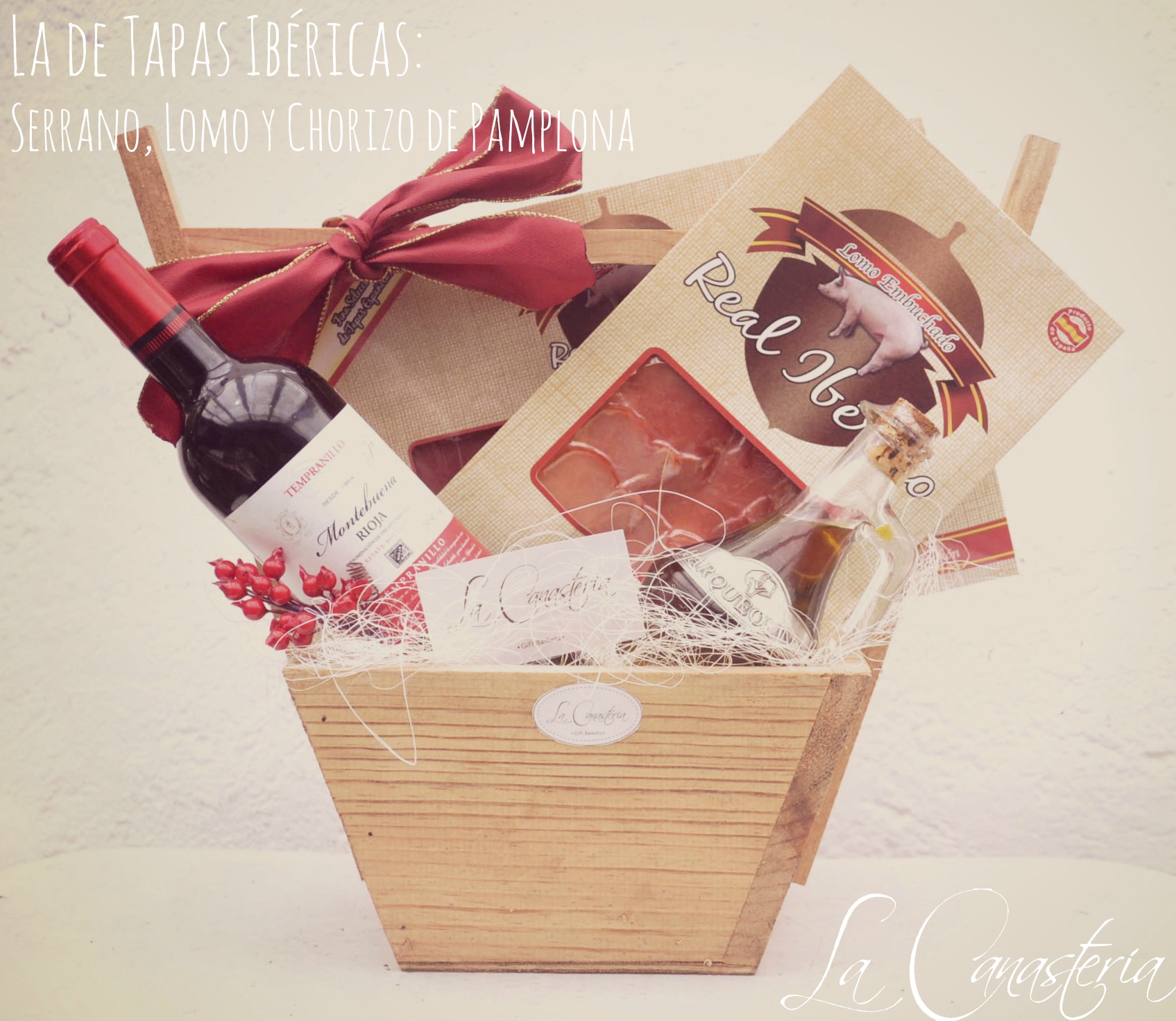 La de Tapas Ibéricas es una canasta navideña con una deliciosa selección de productos españoles! Incluye sobre de tapas con Jamón Serrano Artesanal, Chorizo de Pamplona, de Salamanca y un sobre adicional de Lomo Embuchado con una elegante botella de Aceite de Oliva extra virgen y nuestro tinto Montebuena.