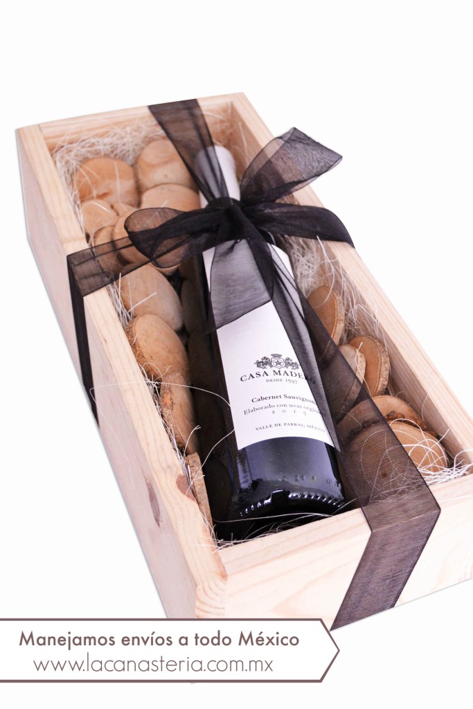Nuestra siguiente propuesta es uno de nuestros diseños mas nuevos en La Canastería que NOS MORIMOS de emoción compartir con ustedes. Una preciosa caja de regalo con VINO MEXICANO ORGÁNICO de Casa Madero. Como elemento mágico de diseño, una cama de rodajas de madera naturales que evocan la esencia de barrica.