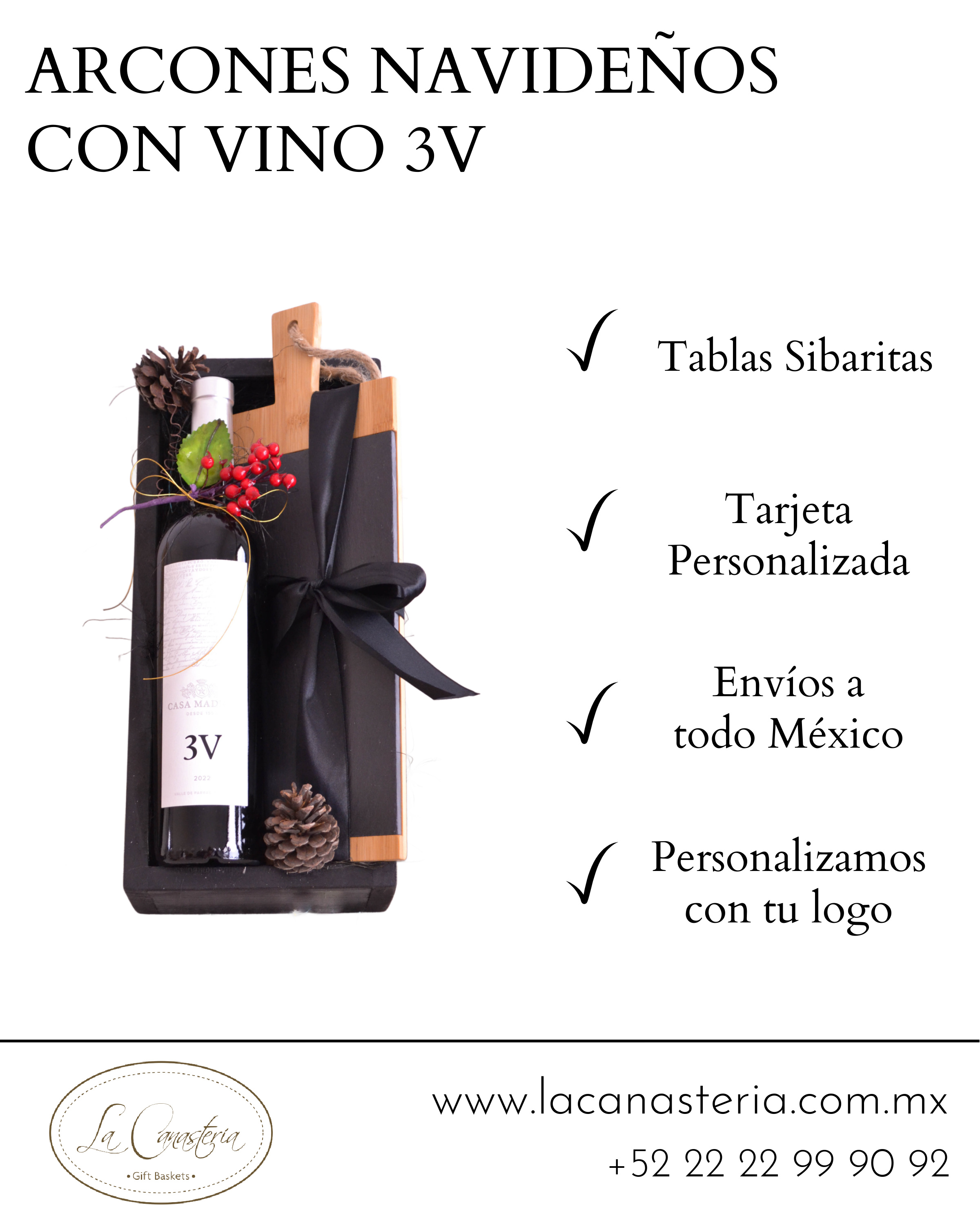 Al ver nuestras cajas, canastas y arcones navideños considera que todos incluyen tarjeta personalizada con tu logotipo y mensaje de ocasión. En algunos modelos podemos hacer branding de tu logo con grábado a láser o serigrafía por un costo extra.